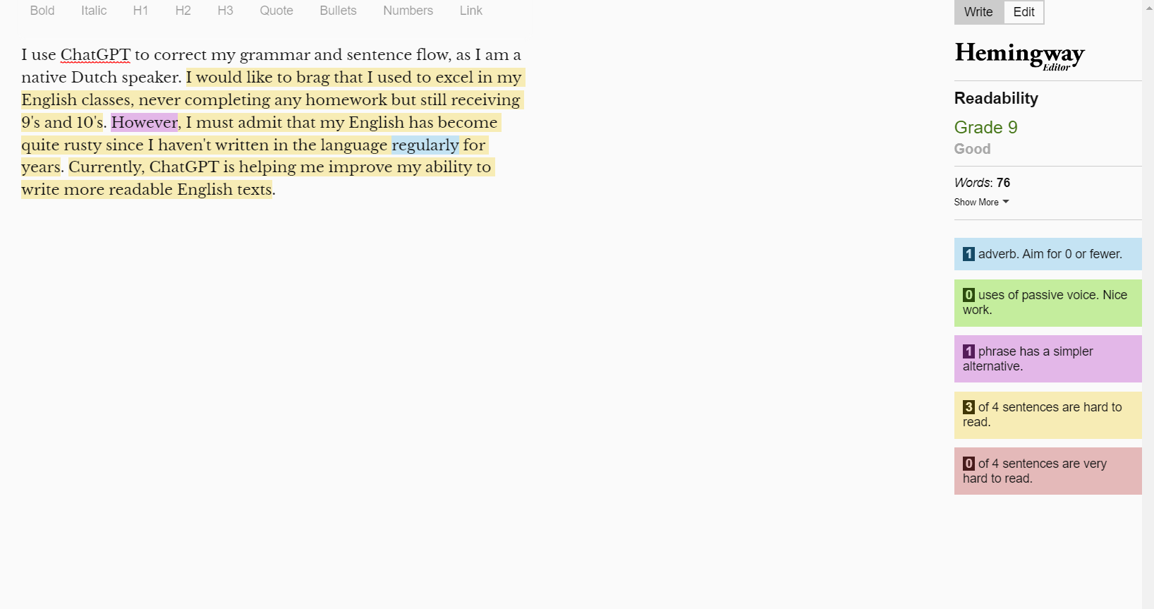 I use ChatGPT to correct my grammar and sentence flow, as I am a native Dutch speaker. I would like to brag that I used to excel in my English classes, never completing any homework but still receiving 9's and 10's. However, I must admit that my English has become quite rusty since I haven't written in the language regularly for years. Currently, ChatGPT is helping me improve my ability to write more readable English texts.