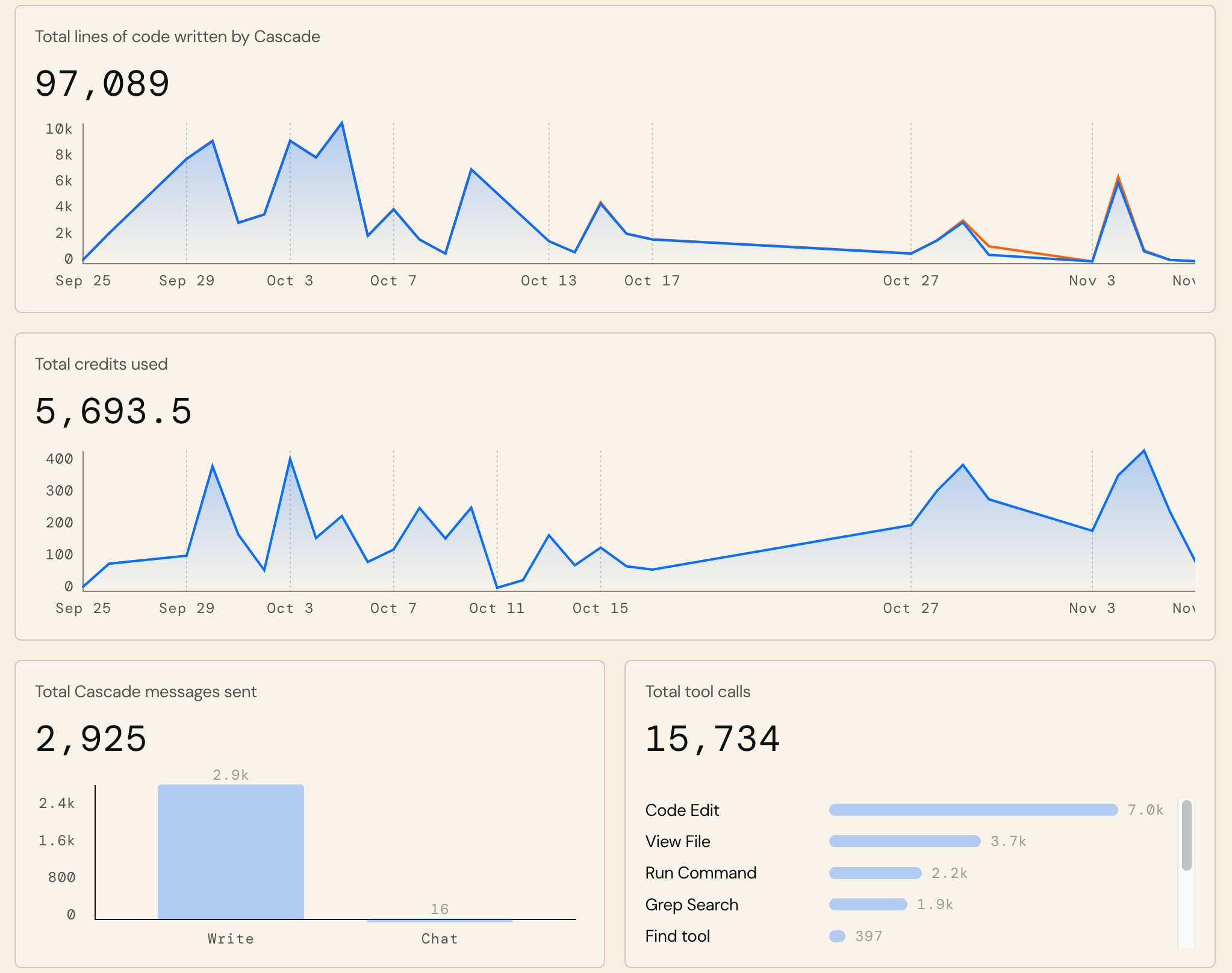 - 15,734 tool calls (including 7,000 code edits)