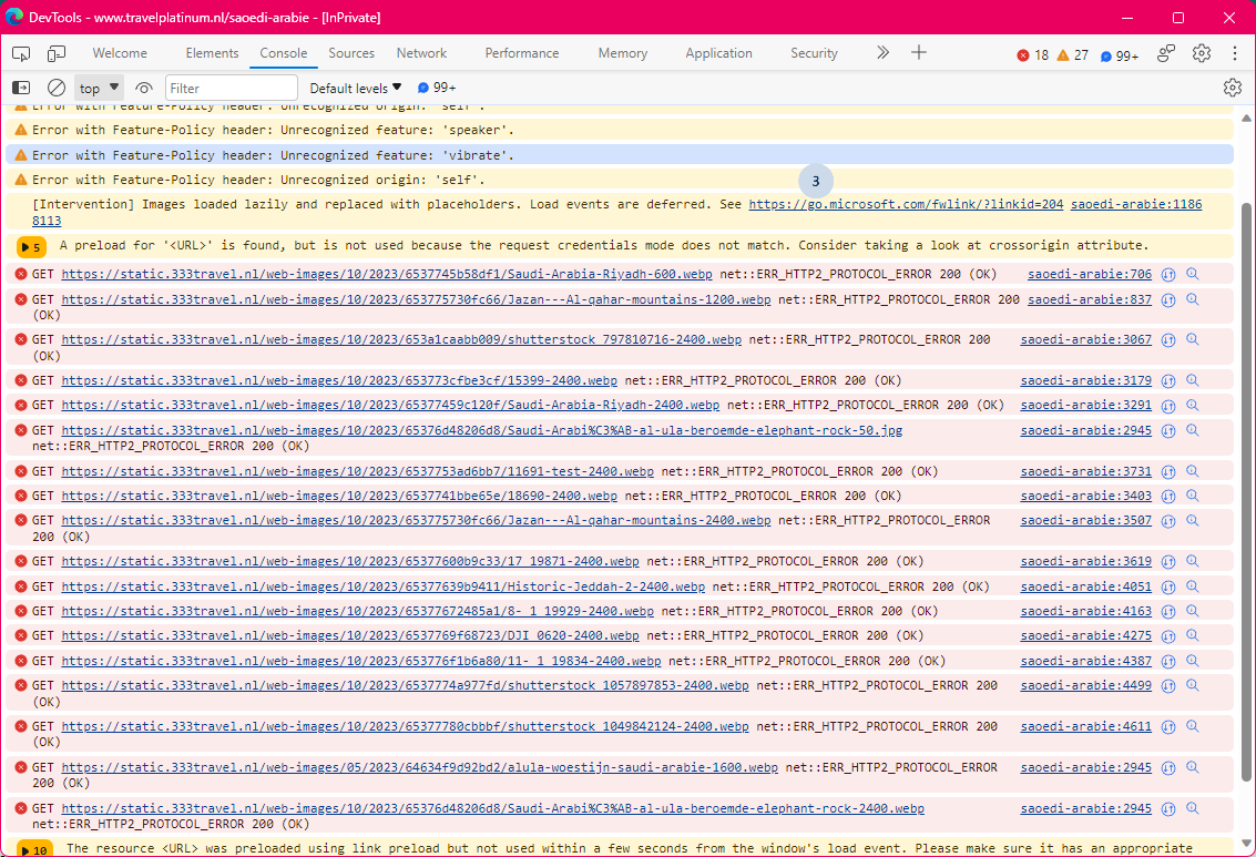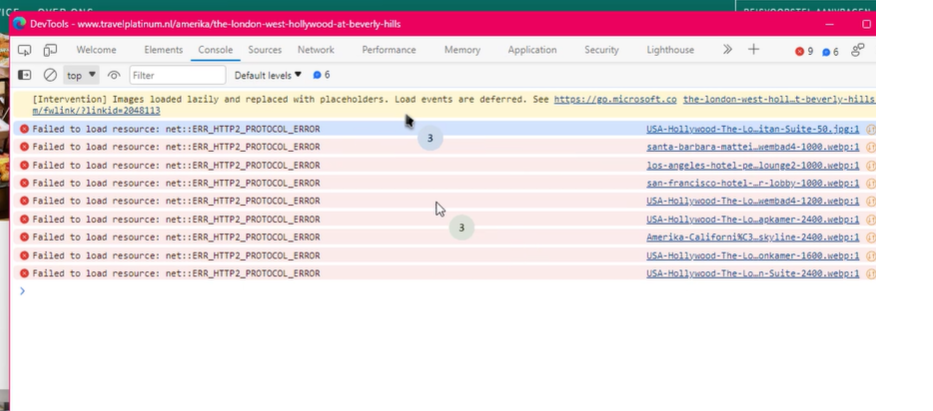 We badly wanted to be able simulate this even better since our bad WiFi spot wasn’t at a desk or something, we were sitting on a bunch of stairs debugging the issue from there. I decided to create a 2nd WiFi hotspot in our office with a throttled connection of 3mbit and see where that takes us. This was it! We could now simulate every refresh a lot of broken images on TravelPlatinum! We are getting somewhere at least. Bear in mind that the 333travel website still was loading every image with no issues.